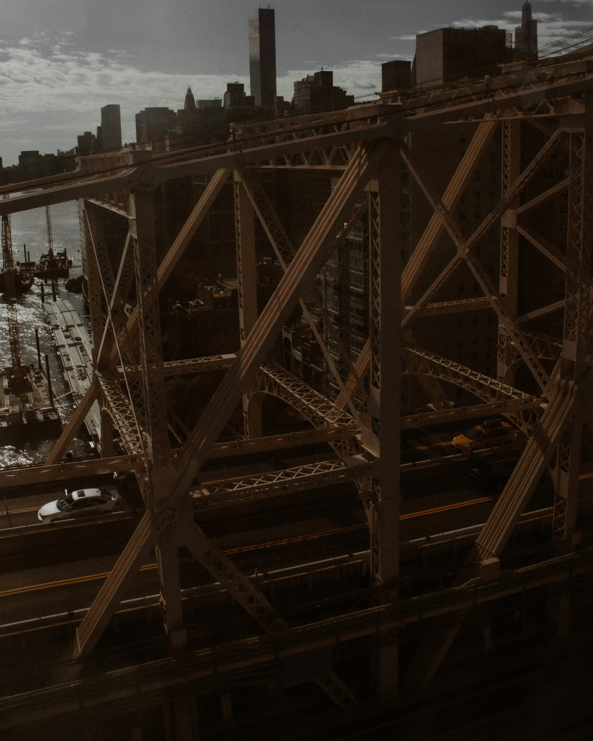The bridge gives you a unique street-level view of sunset over the Lower East Side. Cars pass by, but above them — stillness.